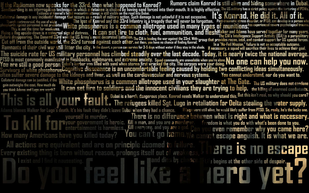 Spec Ops The Line Quotes The loading screens in Spec Ops: The Line really make you think : Wanted pages are pages that are linked to but have not yet been created. Consider filling in information on these pages. The link counter next to each page title references the number of links . VG247 is owned by Gamer Network Limited, a ReedPop company and subsidiary of Reed Exhibitions Limited. ยฉ 2023 Gamer Network Limited, Gateway House, 28 The Quadrant .